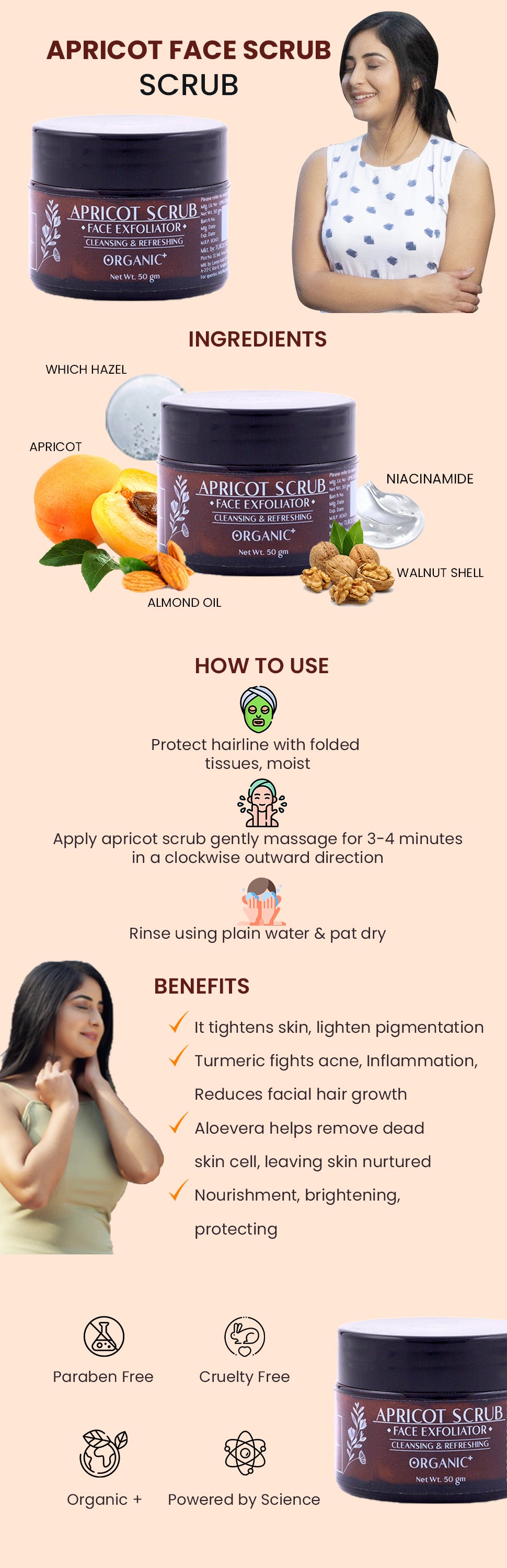 Indulge in the goodness of plant-based antioxidants with our Apricot Scrub - your ultimate solution to deeply cleanse your skin and reveal a brighter, healthier-looking complexion. Enriched with the natural goodness of Witch hazel, Apricot, Niacinamide, Walnut shell, Almond oil, our scrub works deep into the skin to remove impurities, unclog pores, and smooth out the texture of your skin. The powerful blend of natural ingredients gently exfoliates the skin to improve its complexion and impart a natural glow. The apricot scrub is a natural way to get rid of dead skin cells, leaving your skin soft, supple, and rejuvenated. Try our Apricot Scrub today and experience the natural radiance of glowing, refreshed skin.