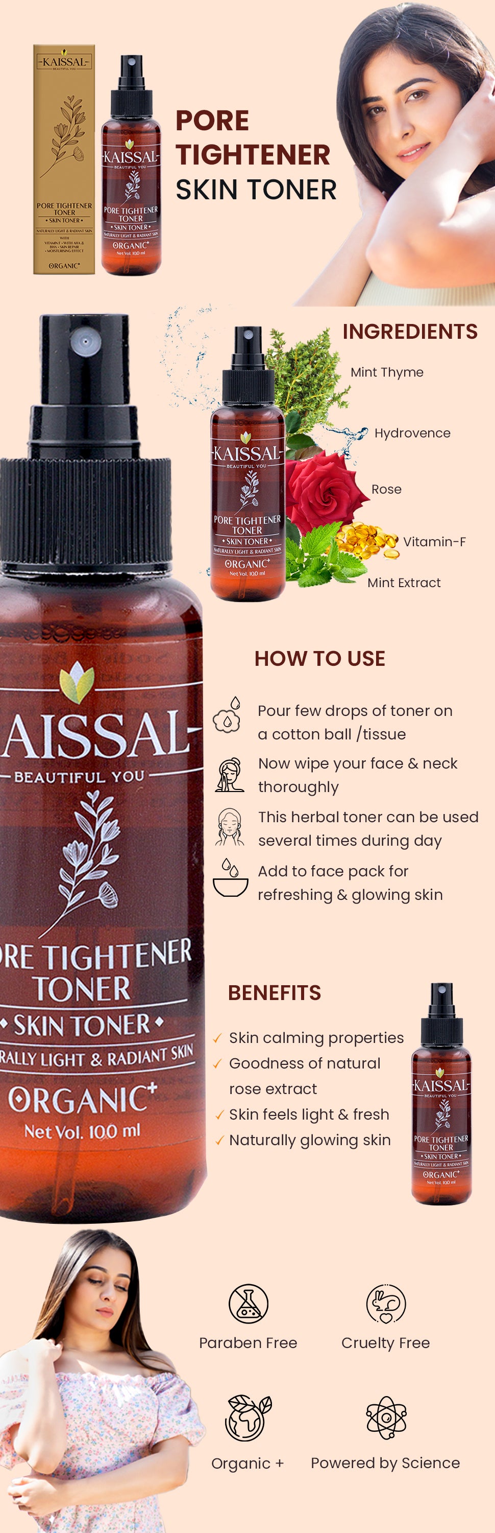 Achieve a flawlessly balanced complexion with our organic Pore Tightening Face Toner. This refreshing, plant-powered formula gently removes impurities and refines pores, without disrupting your skin's natural moisture barrier. Packed with organic extracts, it soothes and hydrates, leaving your skin feeling invigorated and prepped for optimal moisturizer absorption. Reveal your skin's natural radiance with Kaissal Organic Face Toner – experience the transformative power of nature's finest ingredients.