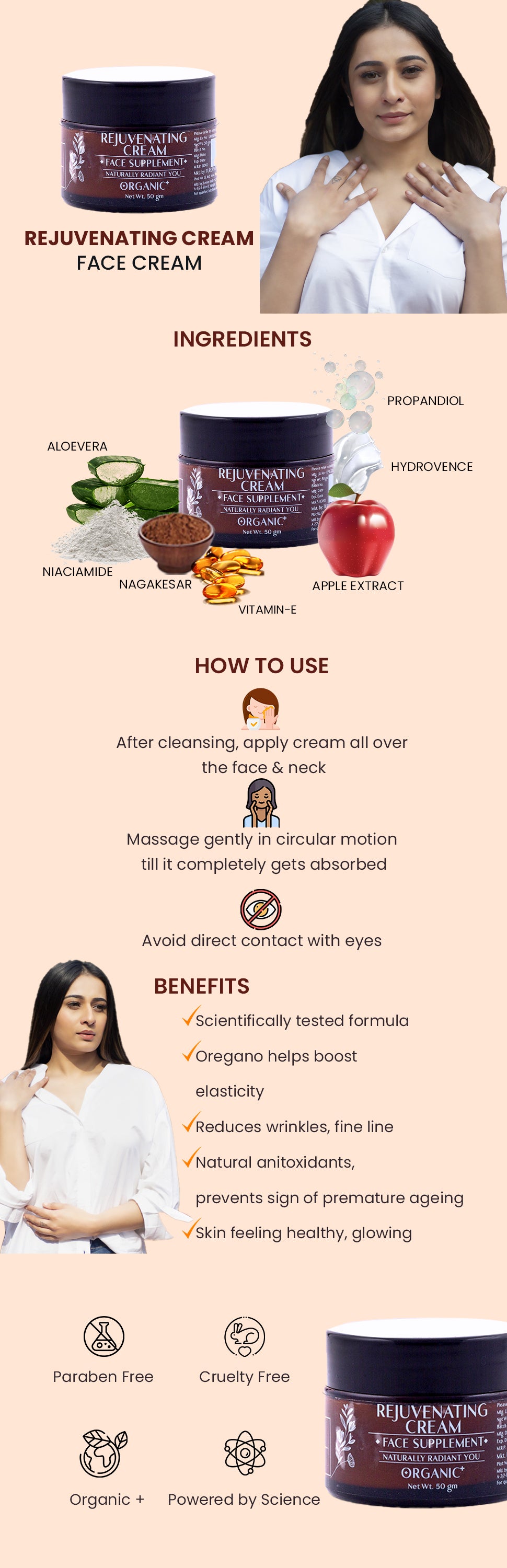 Experience the natural radiance of your skin with our Rejuvenating Cream. This cream, enriched with organic extracts, was once exclusive to the royals, but now you can enjoy its luxurious benefits from the comfort of your own home. The natural ingredients, including Vitamin-E, Propandiol, Hydrovance, Niacinamide, Aloevera, Nagkeshar, Apple Extract etc. visibly purify your skin and provide a natural glow to your complexion. This unique formula not only hydrates and nourishes your skin but also protects it from harmful UV rays and boosts elasticity, helping you achieve a youthful, healthy appearance. Indulge in the rejuvenating effects of this cream and discover the beauty of natural, organic skincare.